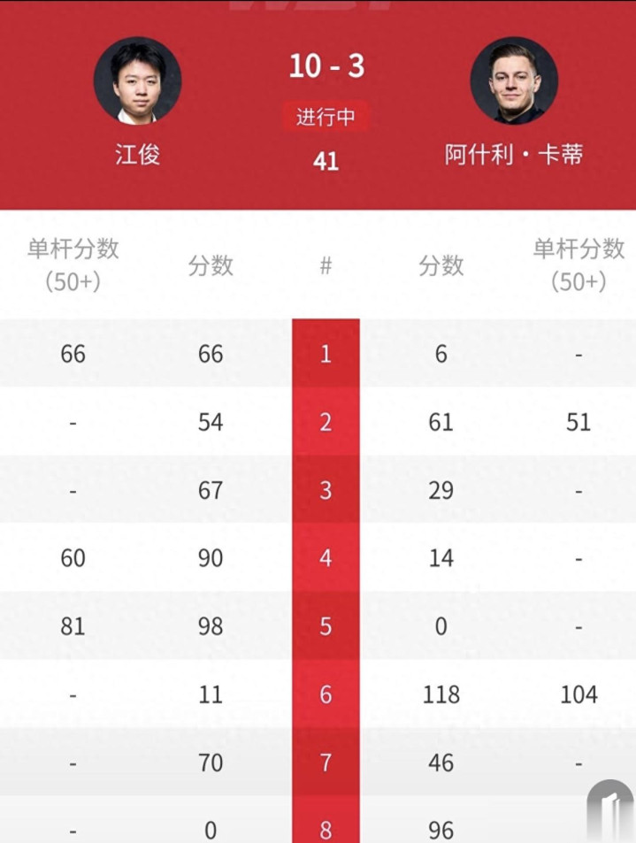 00后小将江俊面对业余选手阿什利·卡蒂,他在比赛后半段突然发力,连续打出单杆101分、72分和70分,上演一波五连鞭,最终以10-3轻松取胜,顺利晋级80强。
