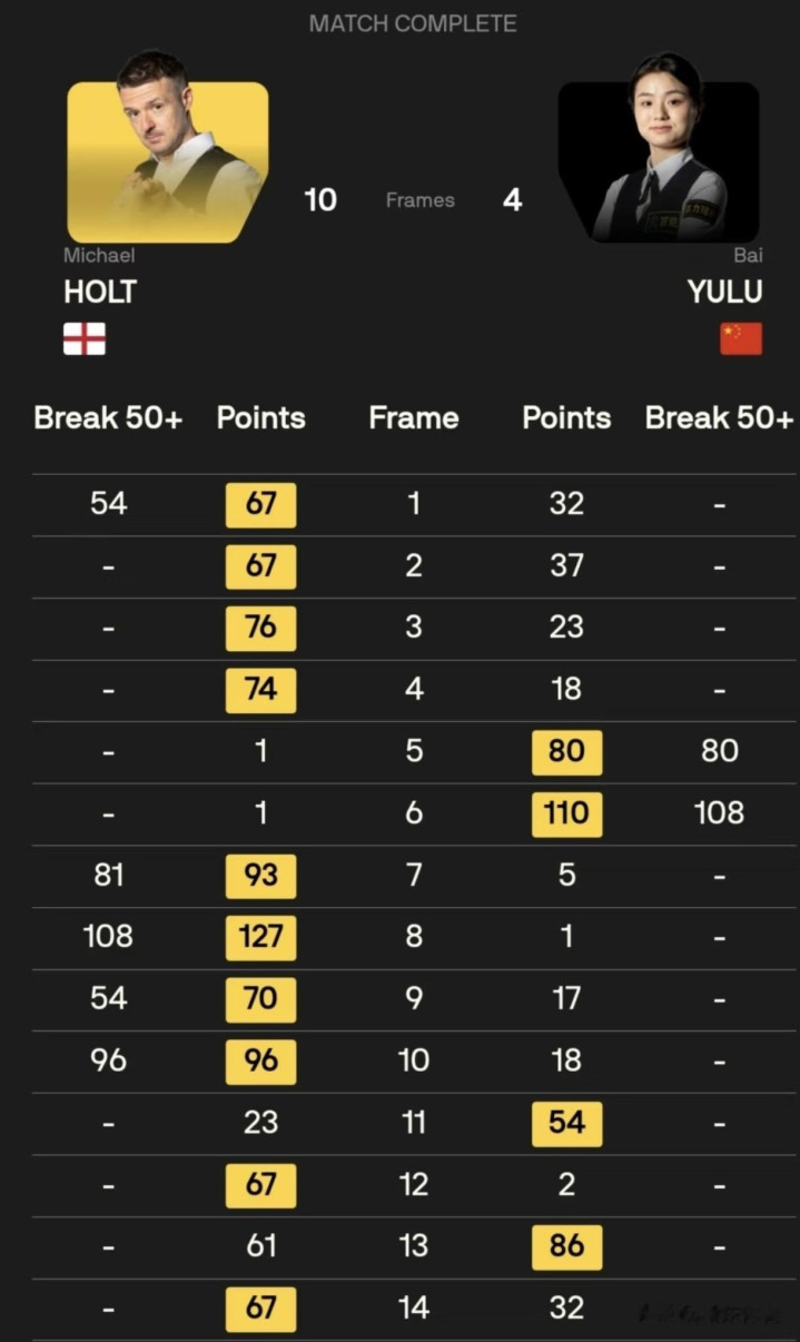 女子斯诺克世界第一白雨露以4-10不敌单局限时赛冠军迈克尔·霍尔特,但白雨露连续两轮比赛都有单杆破百的表现,成为首位在单届世锦赛打出两杆破百的女选手。