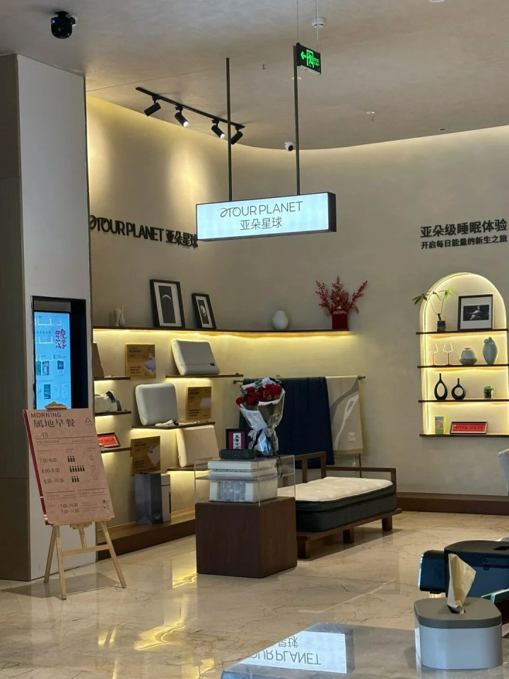 亚朵酒店大堂出售床上用品。(图/社交媒体截图)