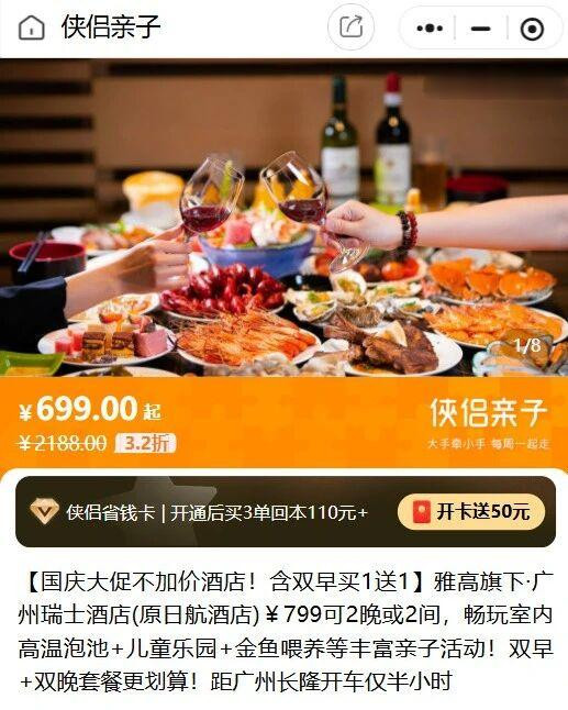 广州瑞士酒店推出国庆大促不加价活动,含双早可享买1送1,799元可住2晚或2间。(图/侠侣亲子平台页面截图)