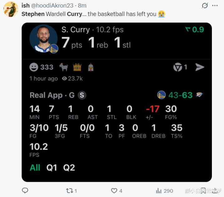 上半场库里14分钟,10中3,三分5中1,拿到7分1篮板1抢断1失误0助攻3犯规,命中率30%,三分命中率20%,真实命中率35%。美球迷:斯蒂芬,篮球似乎已经离你而去了。