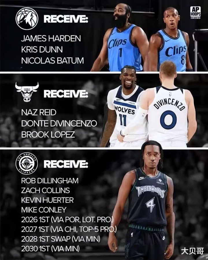 今天美媒提出了三方交易的方案,具体的细节是:快船得到迪林厄姆、扎克科林斯、康利、26年首轮签、27年公牛前五顺位受保护首轮签、28年的首轮互换签和30年森林狼的首轮签。森林狼得到了哈登、邓恩和巴图姆。公牛则是拿下里德、迪温琴佐和大洛佩兹。这笔交易可以说是一笔三赢的交易。