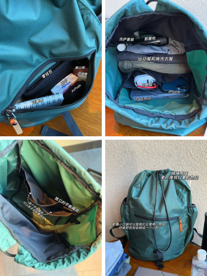 折起来就跟个洗漱包差不多大,直接塞进行李箱角落,出发时一个箱子搞定,手上清清爽爽。到了酒店,把它展开就能背出门,特别方便。你别看它折起来小,打开后容量惊人,装下一大堆东西完全没问题。