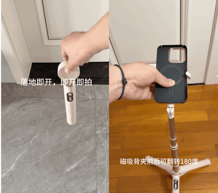 ▲落地就能弹开,操作方便,可以磁吸、可以夹很牢固