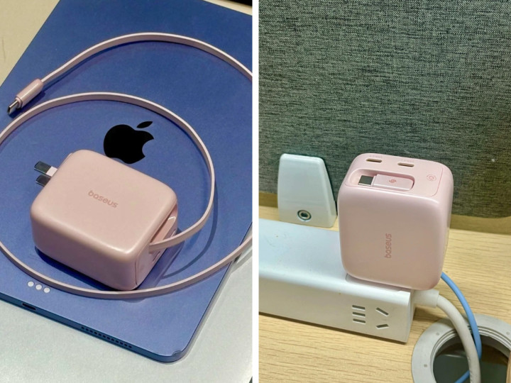 它是67W的快充,连笔记本电脑都能充。除了自带的线,还额外有两个Type-C接口,一个头子能同时充三台设备,出门终于不用带一堆充电头和线了。