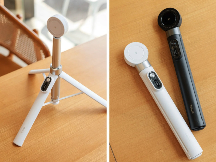 最好用的是它功能特别全:能手持、能拉到1米7当落地杆,也能放桌上用。最方便的是支架带自弹设计,往地上一磕就自动展开,收起来像收伞一样省事。