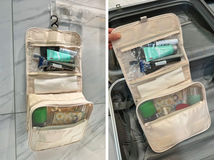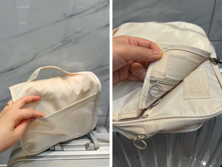 这个洗漱包才10块钱,最实用的就是里面做了5个独立分区。打开后顶上有挂钩,能直接挂在墙上。酒店的洗手台一般都不大,还容易溅水,挂起来就不怕湿了,东西也一眼就能找到。