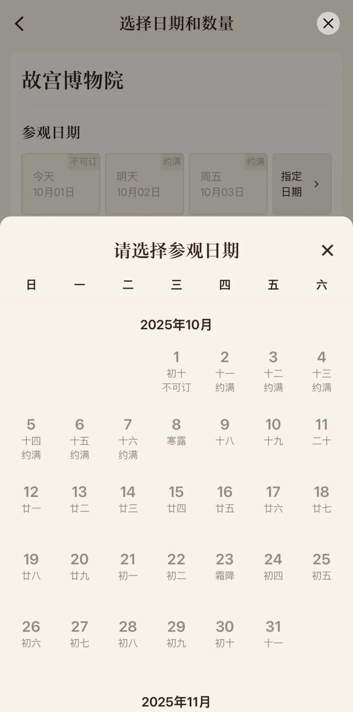 截至10月1日晚,记者搜索发现,包括中国国家博物馆、故宫博物院、陕西历史博物馆、南京博物院、湖南博物院等热门博物馆等可预约时段内的门票均已约满或售罄。