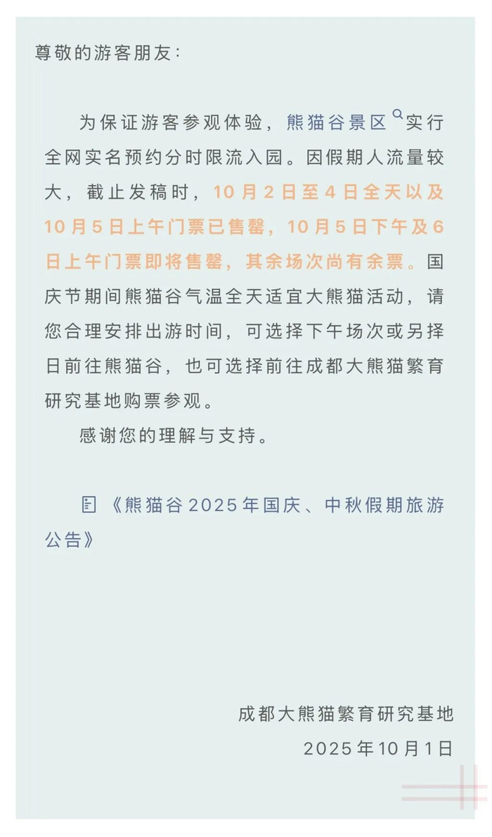 10月1日,成都大熊猫繁育研究基地也发布公告称,10月2日至10月4日全天以及10月5日上午门票已售罄,10月5日下午及6日上午门票即将售罄。